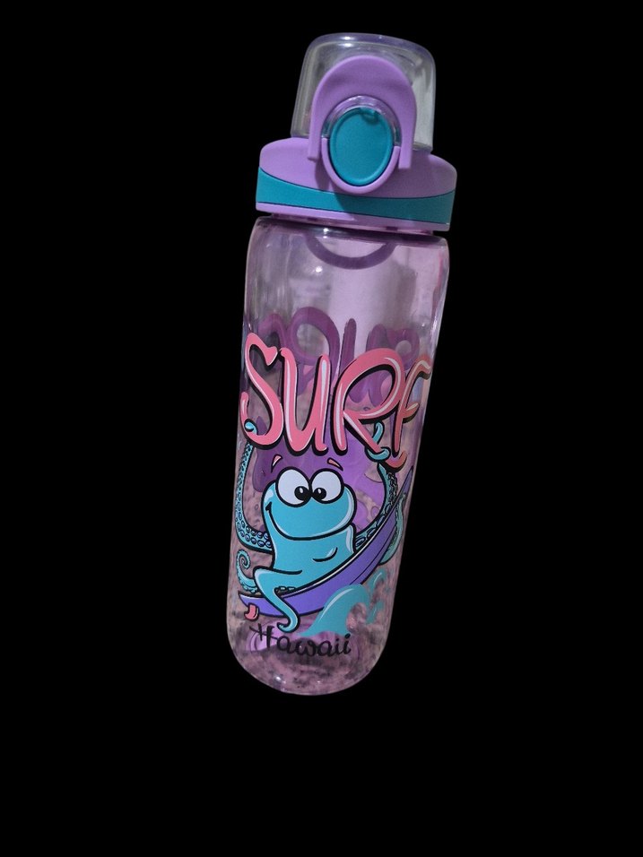 Pastel mor renkte, kapağı açılır çocuk termos suluk. Üzerinde mavi çizgi film karakterli surf temalı eğlenceli desen bulunur. plastiktir pipetli değildir