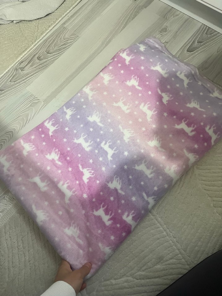 Yumuşak sentetik kumaştan yapılmış, mor tonlu tie-dye desenli ve beyaz unicorn figürlü çocuk battaniyesi.