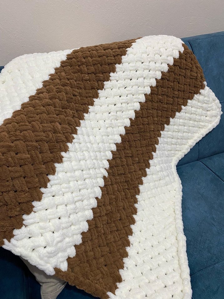 Çocuklar için kahverengi ve beyaz yumuşak örgü battaniye, sıcaklık ve konfor sağlar.Desenlidir.