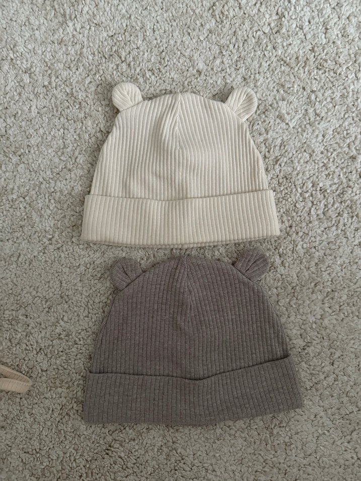 Düz gri ve bej renklerde, küçük kulak detaylı, yumuşak örgü kumaştan çocuk bereleri.