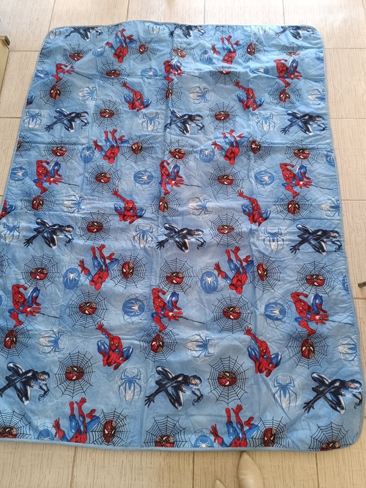 Çocuklar için, yumuşak sentetik kumaştan yapılmış, mavi zemin üzerinde renkli Örümcek Adam desenli battaniye. ️