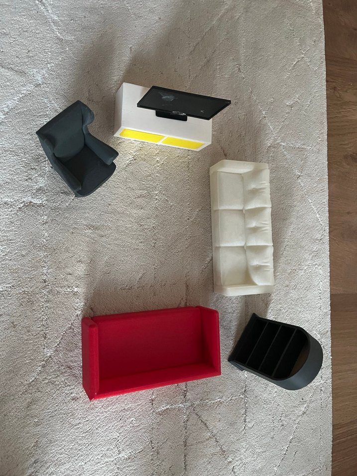 Beyaz ve kırmızı küçük kanepeler, koyu renkli koltuk, beyaz TV sehpası ve siyah raf içeren çocuk oyun mobilyası seti. ️
