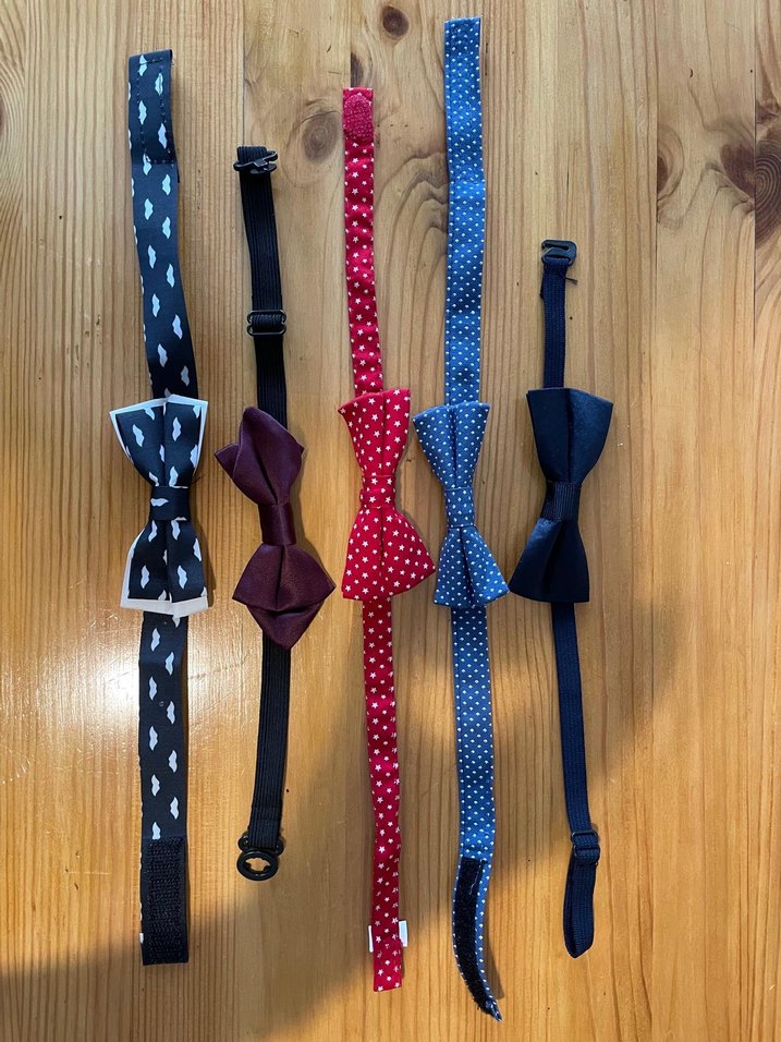 Çocuklar için 5 adet koyu renkli tie-dye ve puantiyeli papyon seti. Ayarlanabilir bantlıdır.