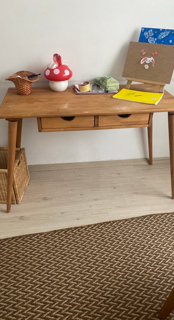 Çocuk odalarına uygun, iki çekmeceli pastel bej renkte ahşap masa. Dört açılı ayaklı ve sade tasarımlı.