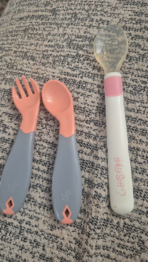 Pastel pembe renkte, gri saplı çocuk çatal ve kaşık ile yumuşak silikon uçlu beyaz-pembe kaşık seti.