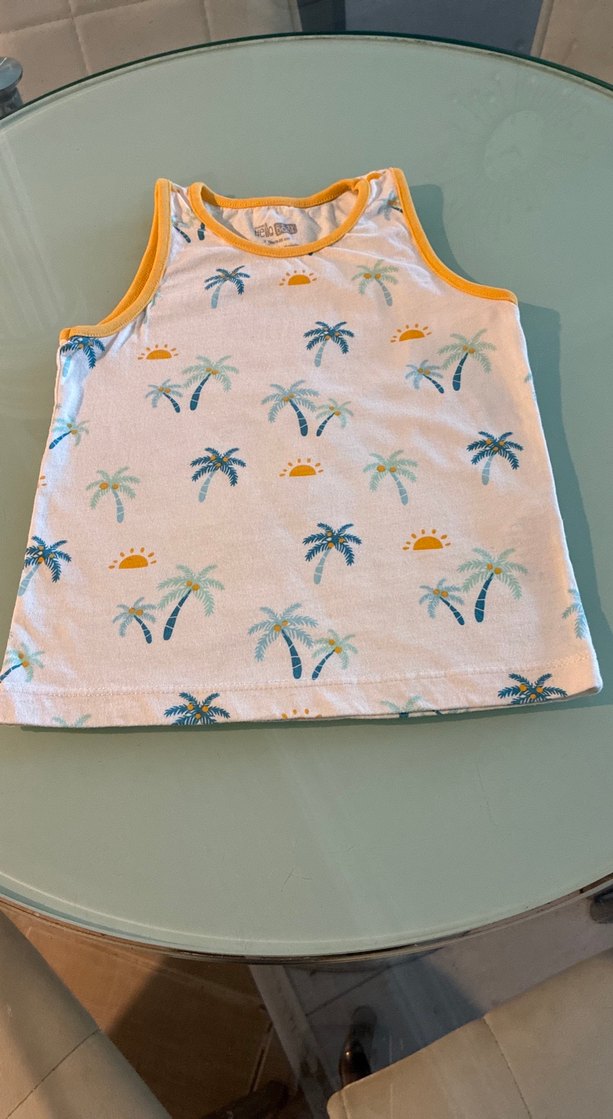 Çocuklar için pastel tonlarda çok renkli, palmiye ve güneş desenli baskılı atlet. Turuncu kenar detaylarıyla rahat bir tasarıma sahiptir. Boy 40 cm kol altı 30 cm