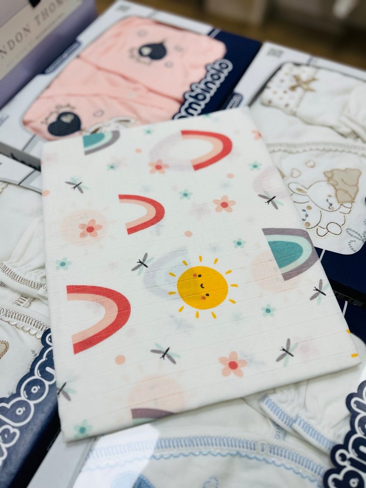 Pastel renklerde güneş, gökkuşağı ve çiçek desenli, yumuşak sentetik kumaştan çocuk müslin örtü