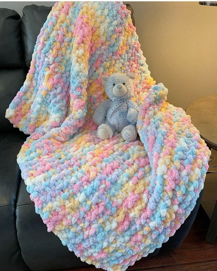 Pastel renklerde, çok renkli tie-dye desenli, yumuşak ve kalın örgü dokulu çocuk battaniyesi.