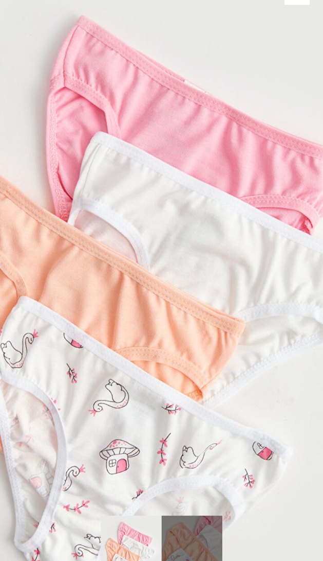 Çocuklar için pastel tonlarda, pamuklu ve yumuşak iç çamaşırları seti. Pembe, beyaz, şeftali ve kuğu desenli modeller içerir.