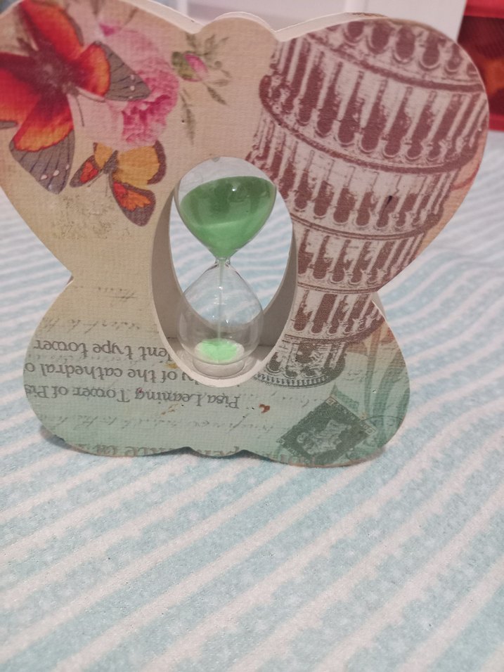 cocuklarin diş fırçalama süresini anlayabilmeleri icin kullandigim yeşil kum saati ve çiçekli, kelebek desenli dekoratif tasarıma sahiptir.