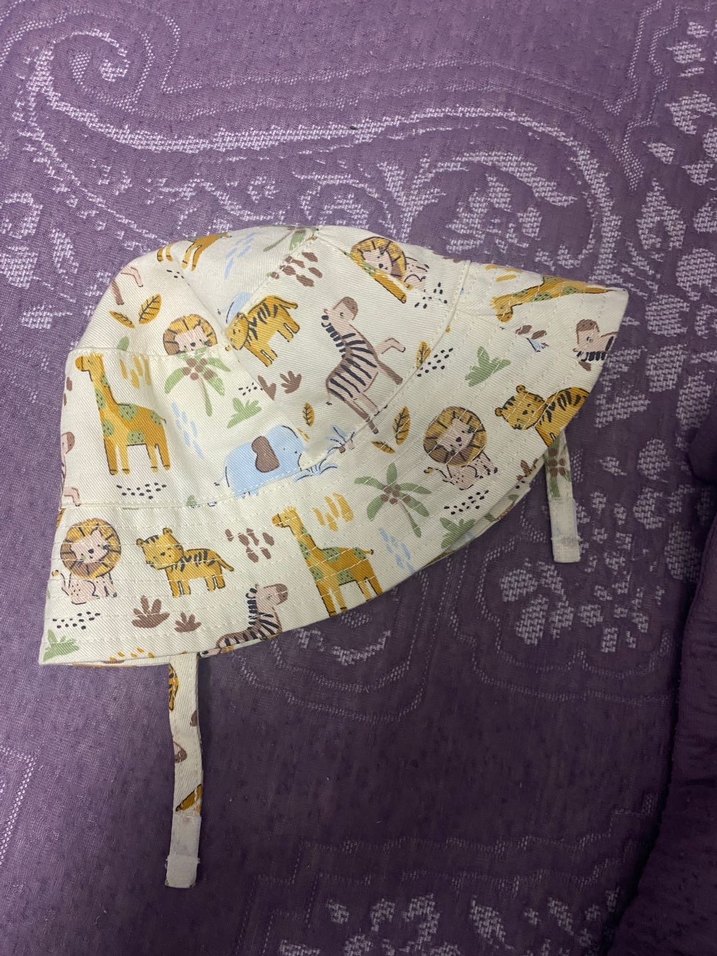 Çocuklar için pastel çok renkli zebra ve hayvan desenli, yumuşak sentetik kumaştan yapılmış, bağcıklı şapka. Çok az kullanıldı temiz 3-6 ay