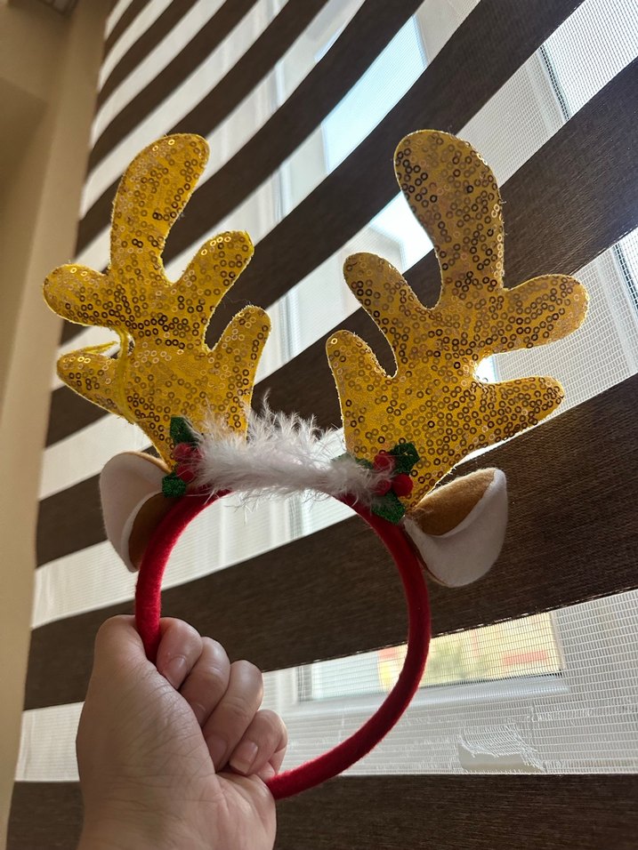 Renkli, payetli altın geyik boynuzu işlemeli detaylarla süslenmiş, yumuşak kırmızı tabanlı çocuk saç bandı