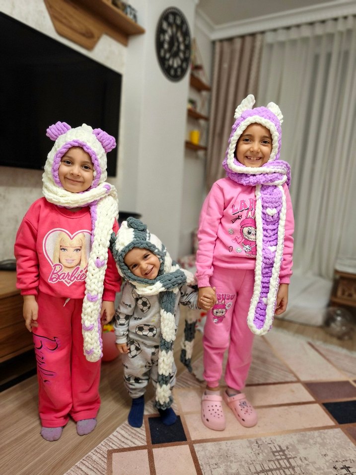 Pastel pembe bağlamalı örgü bere ve atkı seti, bağlamalı desenli ve rahat normcore tarzında, mütevazı çocuklar için uygun.