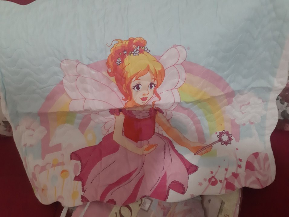 Pastel pembe renkte, baskılı perili yatak örtüsü Yumuşak sentetik kumaştan üretilmiştir, çocuk odalarına neşeli bir hava katar. ♀️