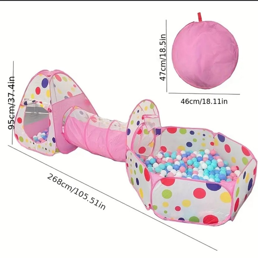 Renkli ve pembe çocuk oyun tüneli ile top havuzu 268 cm uzunluğunda, 46 cm çapındadır. Katlanabilir ve kolay saklanır. 2/3 kere kullanmışızdır ev Küçüklüğünden dolayı fazla kullanamadık yeni gibi