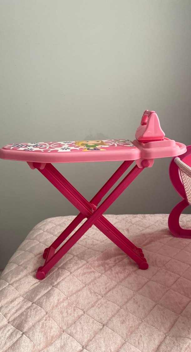 Renkli pembe çocuk oyun ütü masası, katlanabilir yapıda ve küçük oyuncak ütü ile hayal gücünü destekler.