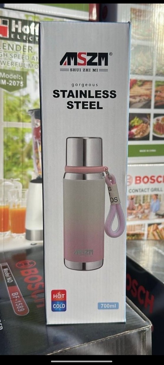 Pembe pastel renkte, paslanmaz çelikten yapılmış çocuk termosu. Güvenli kapak ve taşıma kayışı bulunur. Model M-2075, SHUI ZHI MI. 700ML