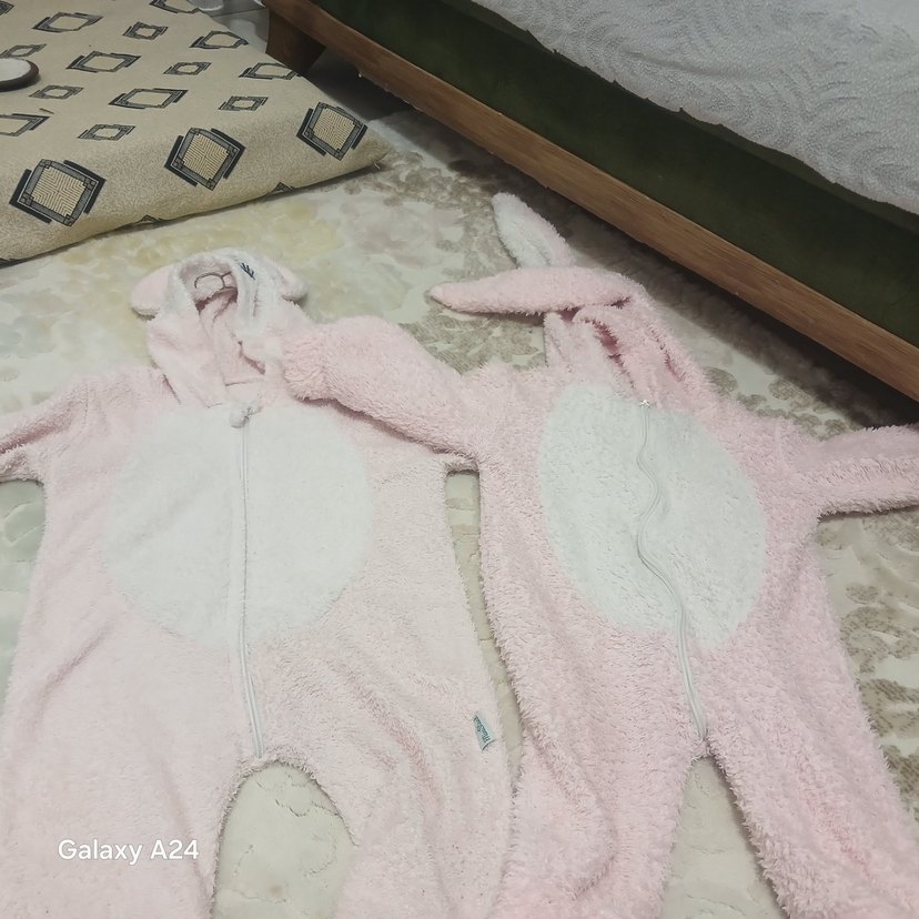 Çocuklar için kapüşonlu ve fermuarlı, yumuşak ve sıcak pembe peluş uyku tulumu. Desensiz ve pastel renkte.