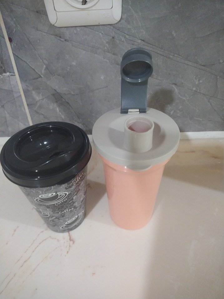 Çocuklar için pembe termos şişe ve gri kapaklı bardak