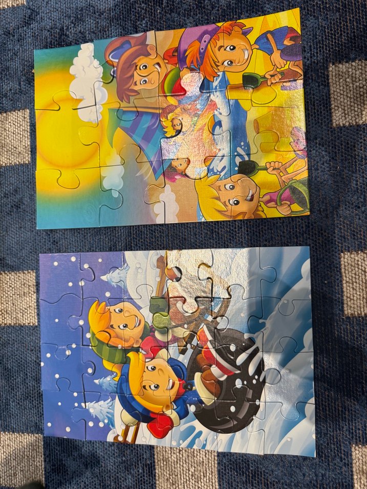 Bu set, çocuklar için açık hava sahnelerinde çizgi film karakterleri içeren iki renkli puzzle içerir. Her puzzle, kolay tutulabilen büyük parçalara sahiptir.