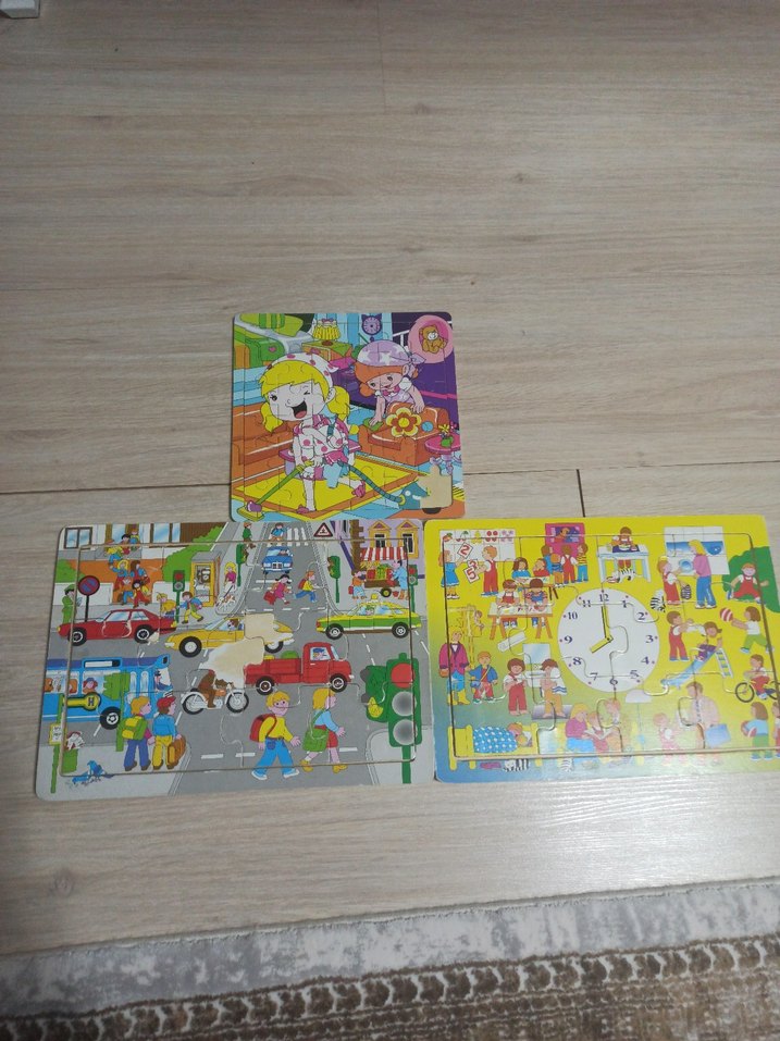 Çocuklar için renkli ve eğlenceli 3'lü puzzle seti. Çocuklar, araçlar ve saat temalı sahneler içerir. puzzle yapboz üçlü