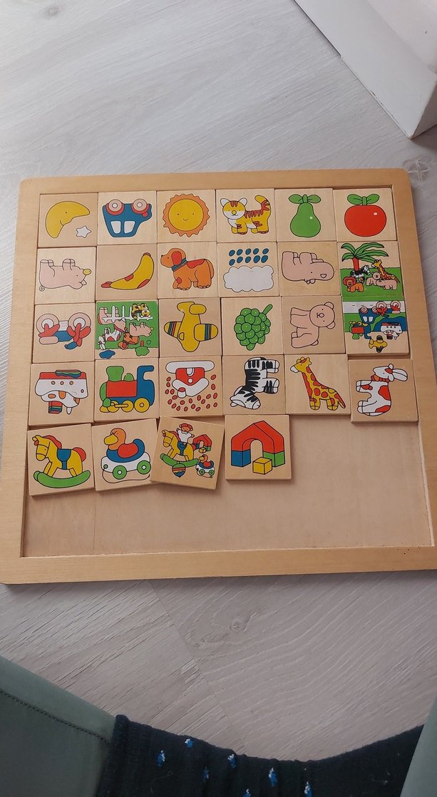 Çocuklar için çeşitli hayvan ve nesne resimleriyle renkli ahşap yapboz parçası içerir. Eksikleri vardır.