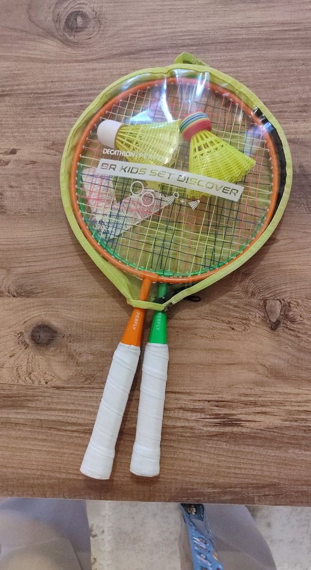İki raket ve iki tüy topu içeren renkli çocuk badminton seti, beyaz sapları ve canlı renkleriyle dikkat çekiyor .
