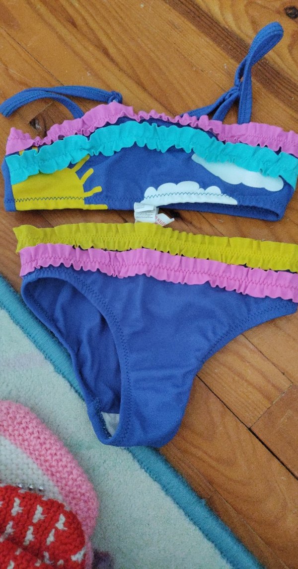 Mavi tabanlı bağcıklı, renkli fırfırlı detaylara sahip kız çocuk bikini. Plaj için uygun, askılı tasarım.