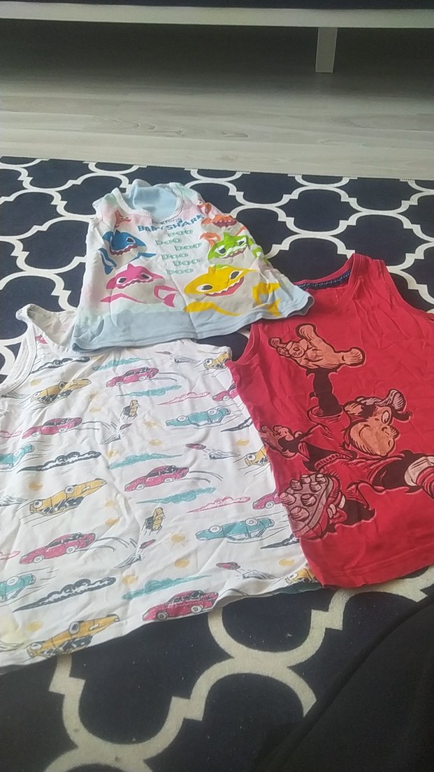 Araba ve çizgi film karakterleri gibi çeşitli desenlere sahip renkli baskılı çocuk atletleri seti. Yumuşak ve rahat kumaş.