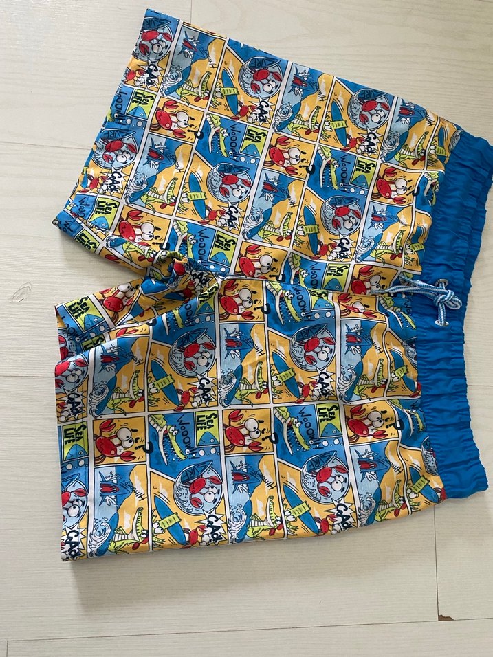 Renkli baskılı desenli, kısa kollu, elastik bel bantlı çocuk mayo şortu.