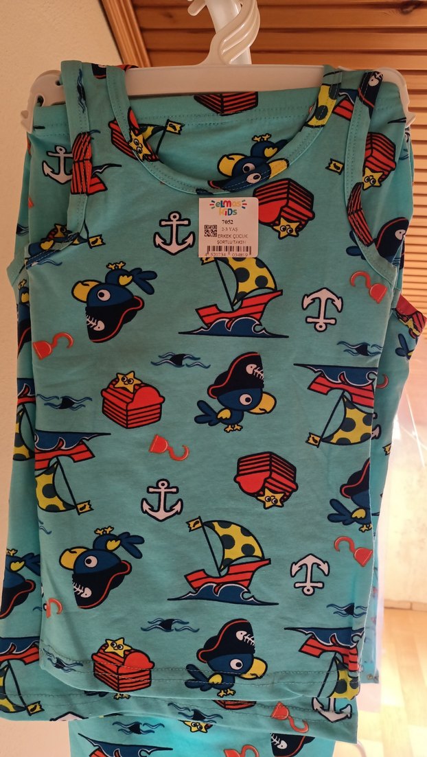 Mavi zemin üzerine renkli baskılı, deniz temalı ve hayvan figürlü çocuk atletidir.