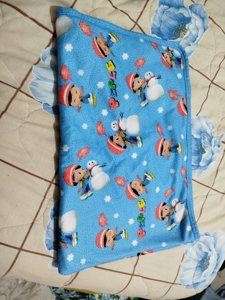 Yumuşak ve sıcak kumaştan yapılmış, renkli baskılı desenlere sahip mavi çocuk battaniyesi. Rahatlık ve sıcaklık sağlar.