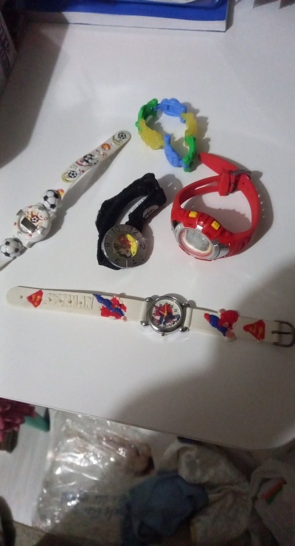 Çocuklar için baskılı desenli, tokalı plastikten yapılmış renkli saatler. Spor ve süper kahraman temalı çeşitli modeller içerir. ⌚ 4 saat ve 1 adet bileklik .çalışmıyorlar. kusurlarını fotoğraflarda belirttim