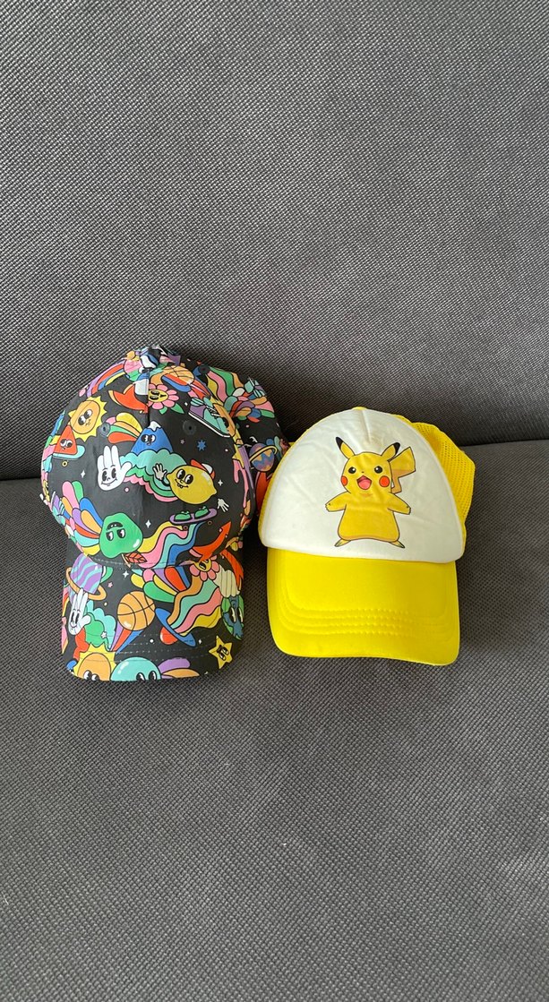 Çocuklar için baskılı desenli, ayarlanabilir cırt cırtlı iki renkli şapka. Biri Pikachu baskılı, diğeri çok renkli karikatür desenli.