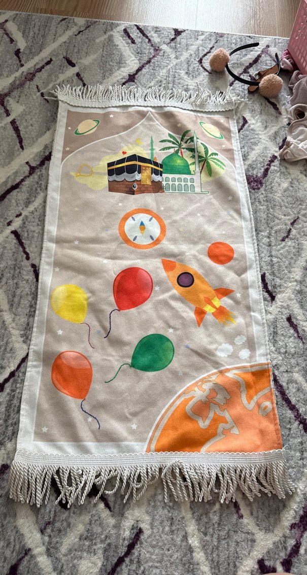 Çocuklar için çok renkli baskılı yumuşak tekstil battaniye, püsküllü kenarlarla. Balonlar, roket ve simgeler içerir.