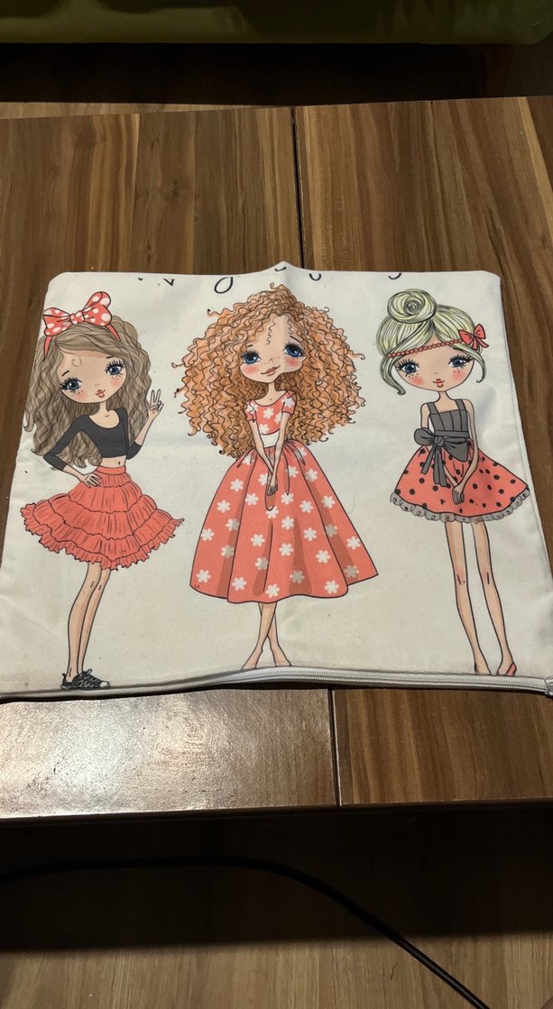 Pastel tonlarda, üç şık kız figürlü baskılı çocuk yastığı. Yumuşak sentetik kumaştan üretilmiştir.Ufak bir dikiş hatası var fotoğrafta belirttim. O yüzden fiyatı uygun tuttum.