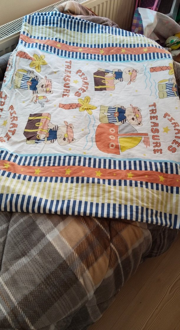 Çocuklar için pastel tonlarda çok renkli baskılı tekstil yatak örtüsü, korsan ve hazine temalı çizimler ve "TREASURE" yazısı içerir. Kenarlarında çizgili ve yıldız desenleri vardır. ️