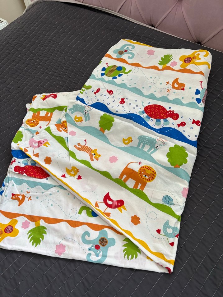 Çocuklar için renkli baskılı hayvan ve doğa desenlerine sahip yumuşak tekstil uyku örtüsü.