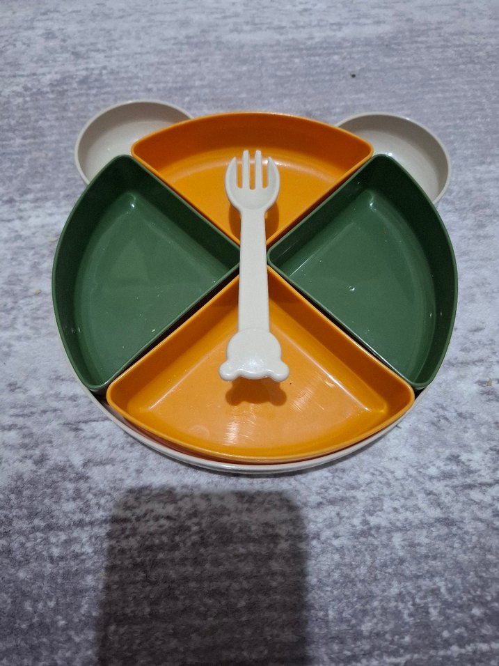 Çocuklar için dört bölmeli renkli tabak ve beyaz çatal içeren set. Yemekleri ayırmak için kullanışlıdır. ️