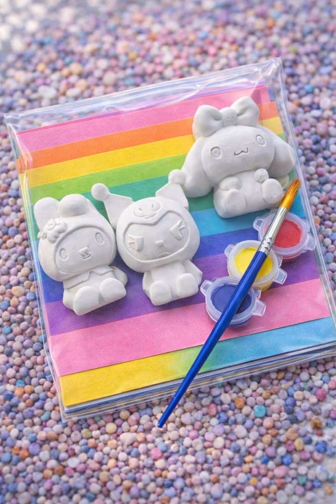 Üç beyaz alçı figür, bir fırça ve üç küçük boya kabı içeren çocuk boyama seti, yaratıcılığı destekler.