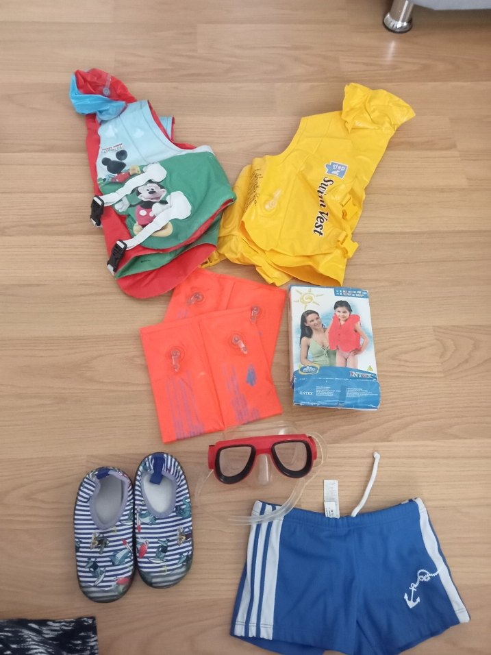 Canlı renklerde çocuklar için deniz ve havuz seti; can yelekleri, şort, su ayakkabısı ve gözlük içerir. Su aktiviteleri için rahat ve renkli tasarım. hepsi sağlam kutulu olan sıfır diğer yelekler 1-2 kullanıldı kolluklar hiç kullanılmadı ister toplu ister tek tek alabilirsiniz toplu fiyat 750 TL kaçırmayın