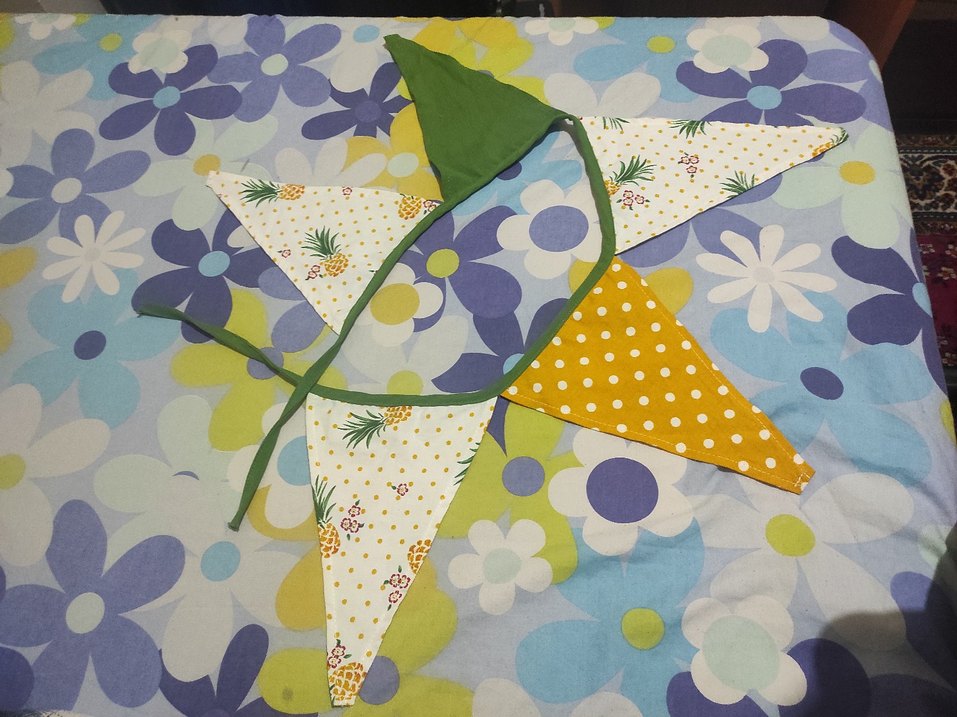 Sentetik kumaştan yapılmış, çeşitli desenlere sahip renkli çocuk duvar aksesuarı. Yeşil kapüşon ve ananas ile puantiyeli üçgen parçalar içerir.
