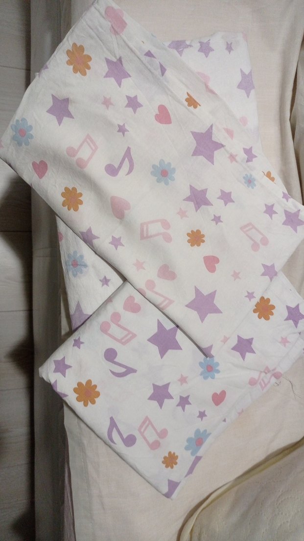 Çocuklar için pastel tonlarda, mor renkli, yıldız, kalp, çiçek ve nota desenli yumuşak sentetik kumaştan uyku seti. yastık nevresim ve çarşaftan oluşuyor