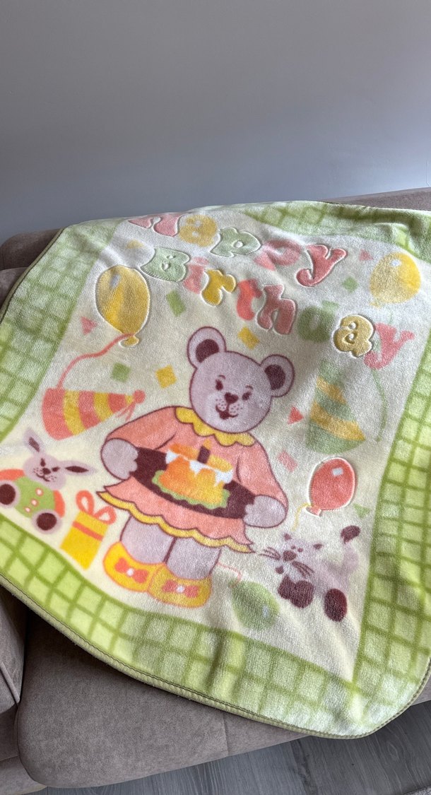 Pastel renklerde, ayı ve doğum günü temalı desenli, yumuşak ve sıcak çocuk battaniyesi .