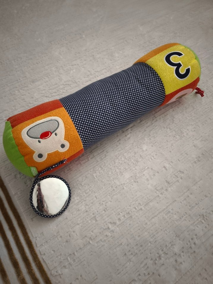 Yumuşak ve sıcak kumaştan yapılmış, desenli renkli çocuk yastığı. Küçük ayna ekiyle oyun keyfi artırılmış.