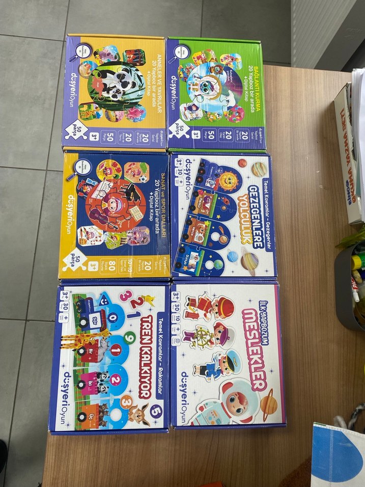 Çocuklar için trenler, meslekler ve gezegenler temalı renkli yapboz seti. 3 yaş ve üzeri için uygun, öğrenmeyi eğlenceli hale getirir.