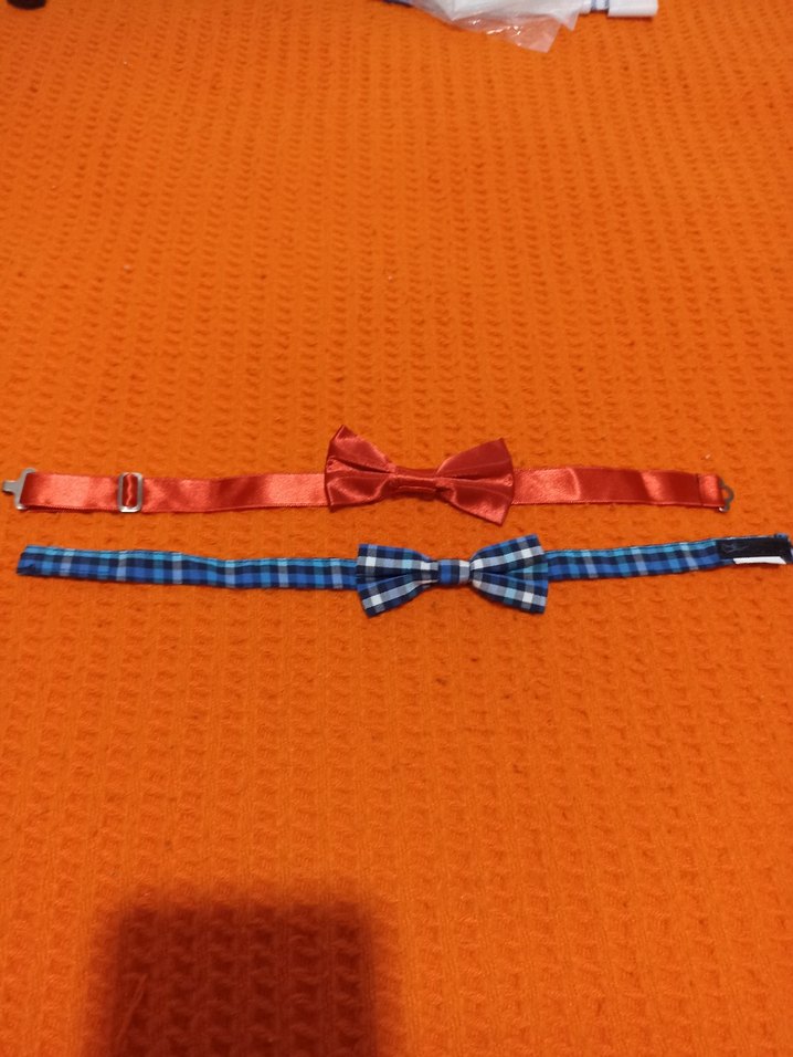 Çocuklar için iki renkli papyon seti; biri kırmızı saten, diğeri mavi ekose desenli, klasik ve sokak modasına uygun.