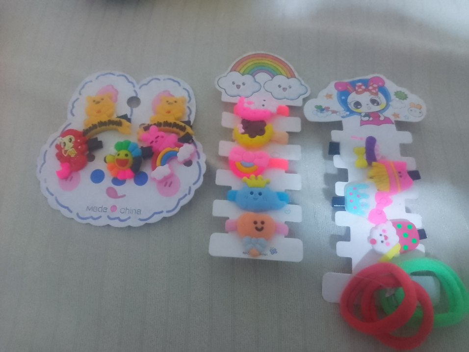 Çeşitli şekil ve baskılı desenlere sahip çocuklar için renkli elastik saç tokaları.