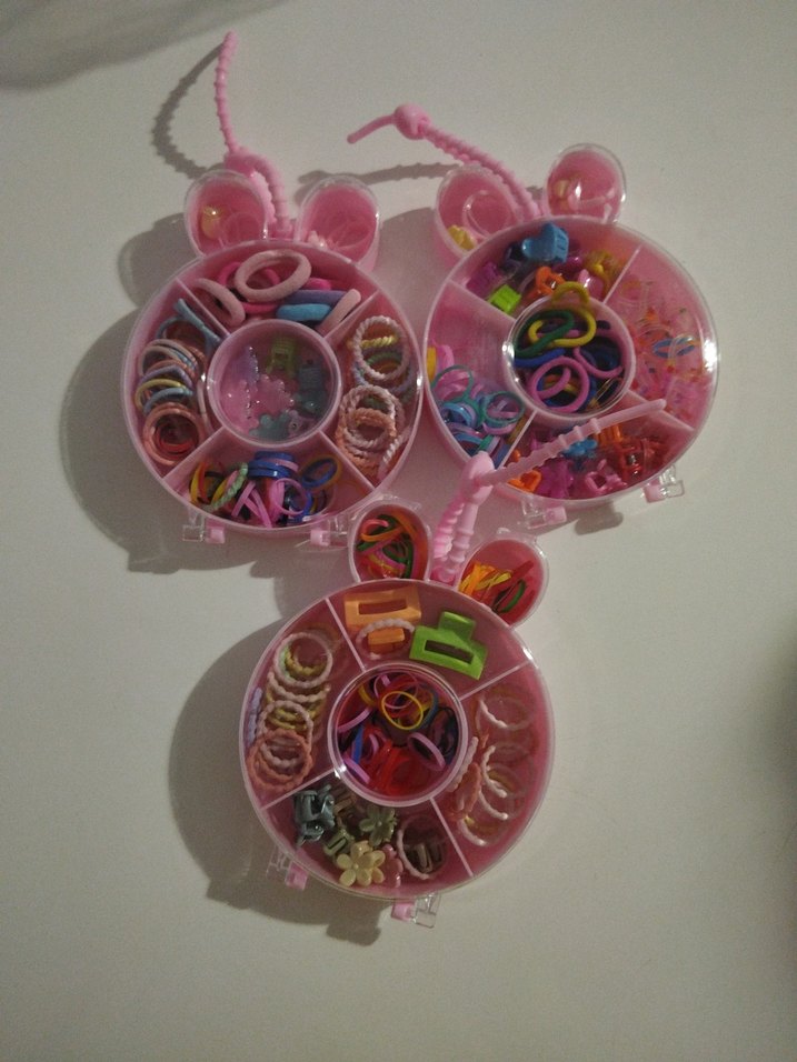 Çocuklar için renkli elastik saç tokaları ve klipsler içeren, bohem ve retro tarzda bir set. Canlı aksesuar sevenler için uygun.