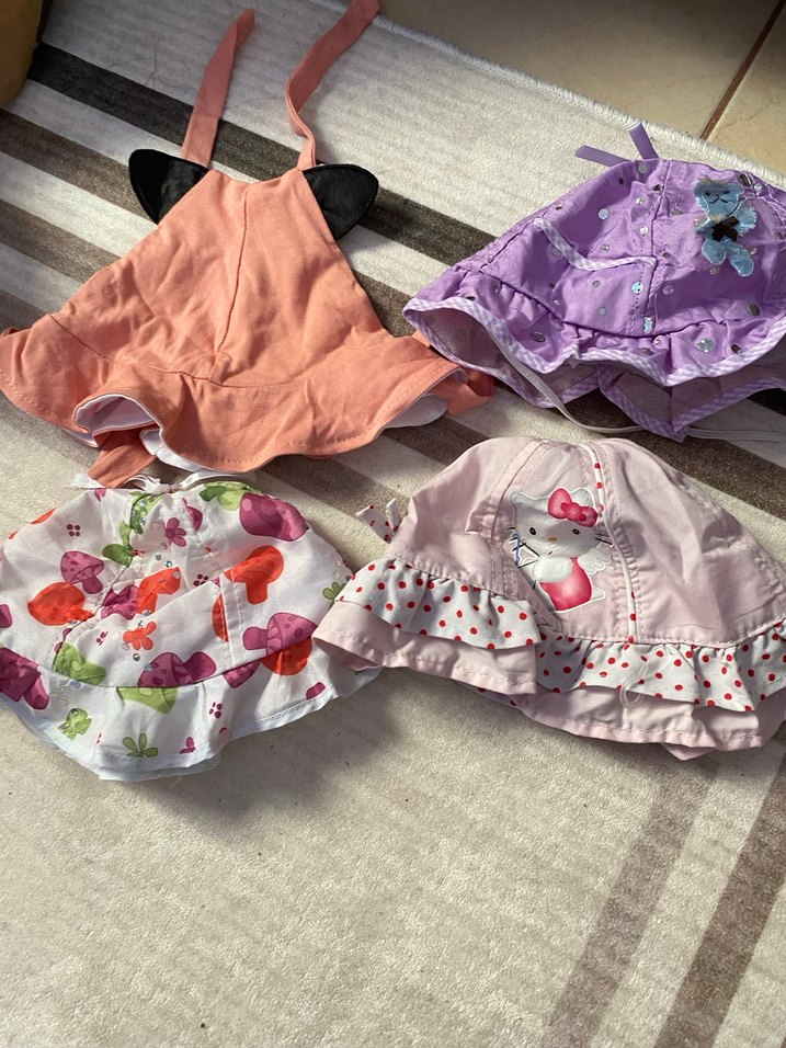 4 adet şapka Yumuşak sentetik kumaştan yapılmış, nakışlı desenler ve fırfır detaylı renkli çocuk şapkaları. Her şapka çiçekli ve karakterli desenlerle bohem tarzına uygun.